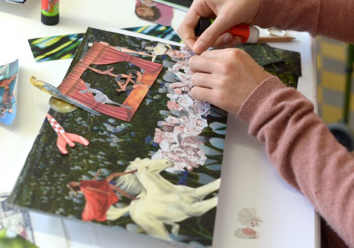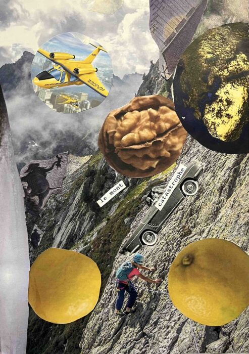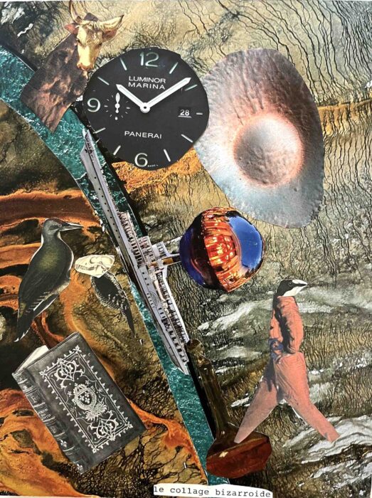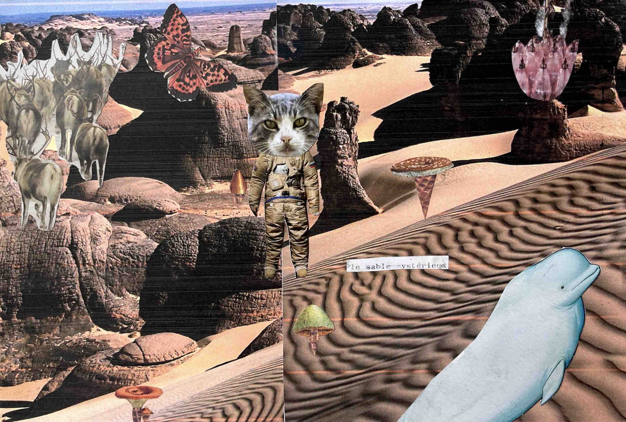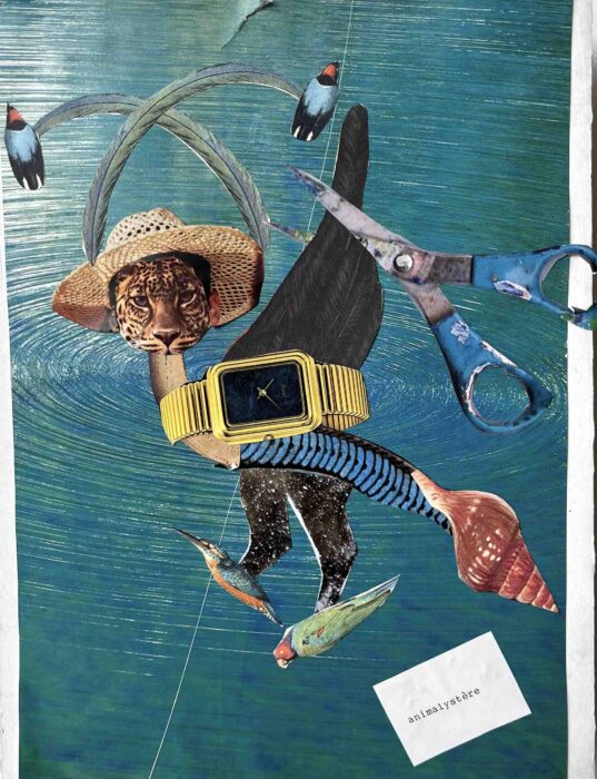 Détourne des images en les replaçant dans un contexte absurde en utilisant le photomontage et en inventant des sous- titres déjantés. Technique découpage et collage, peinture.